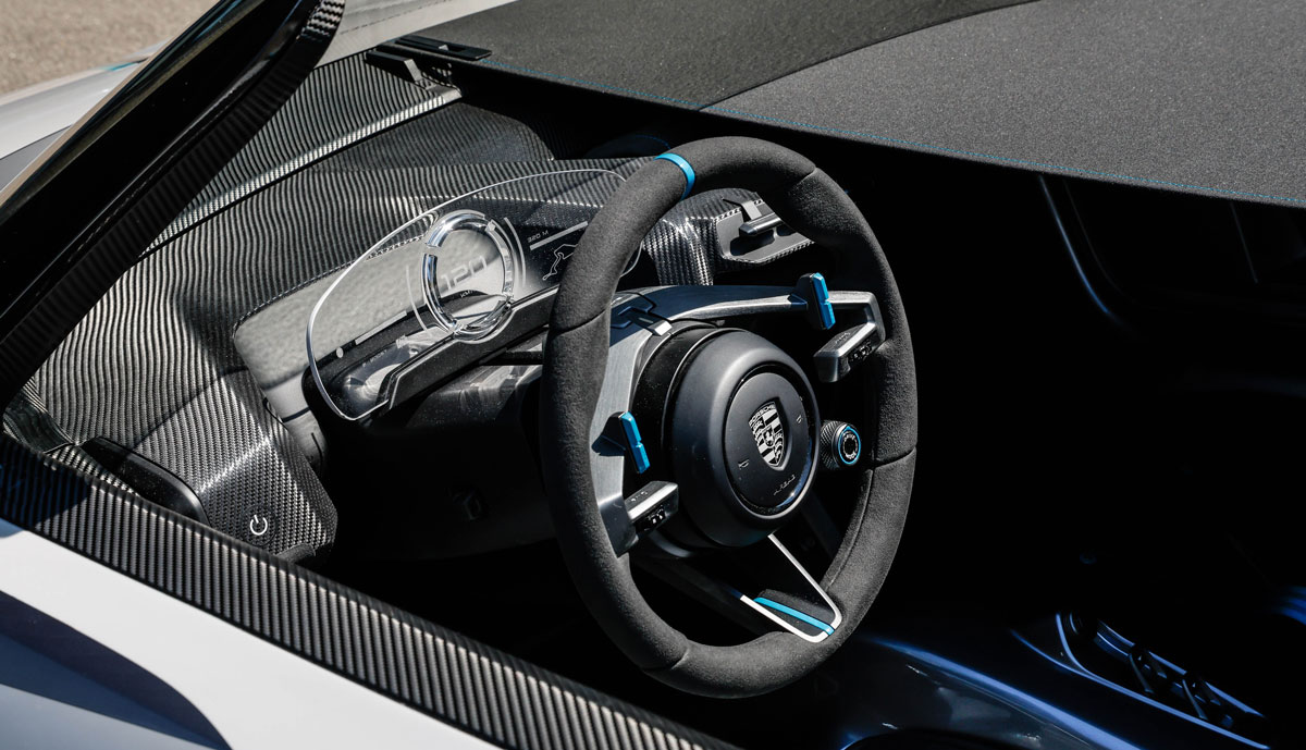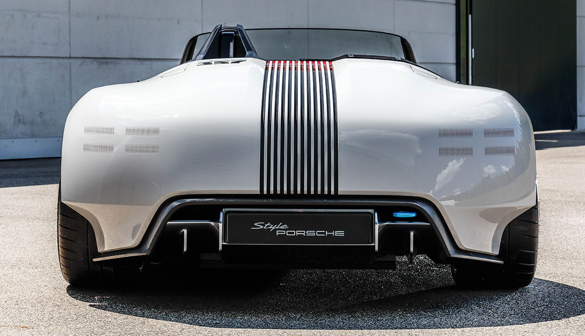 Weitere Details des Exterieur-Designs sind von der Schwester-Studie bekannt: Das Vier-Punkt-Lichtsignet an der Front ist als Reminiszenz an den Porsche 356 rund ausgeführt. Die Heckleuchten sitzen unter einem punktförmigen, gefrästen Verlaufsmuster. Das vertikale Gittermuster im Heck ist optisch ebenso an die erste Porsche-Modellreihe angelehnt. Die dritte Bremsleuchte ist formal bündig in das Gitter integriert.
