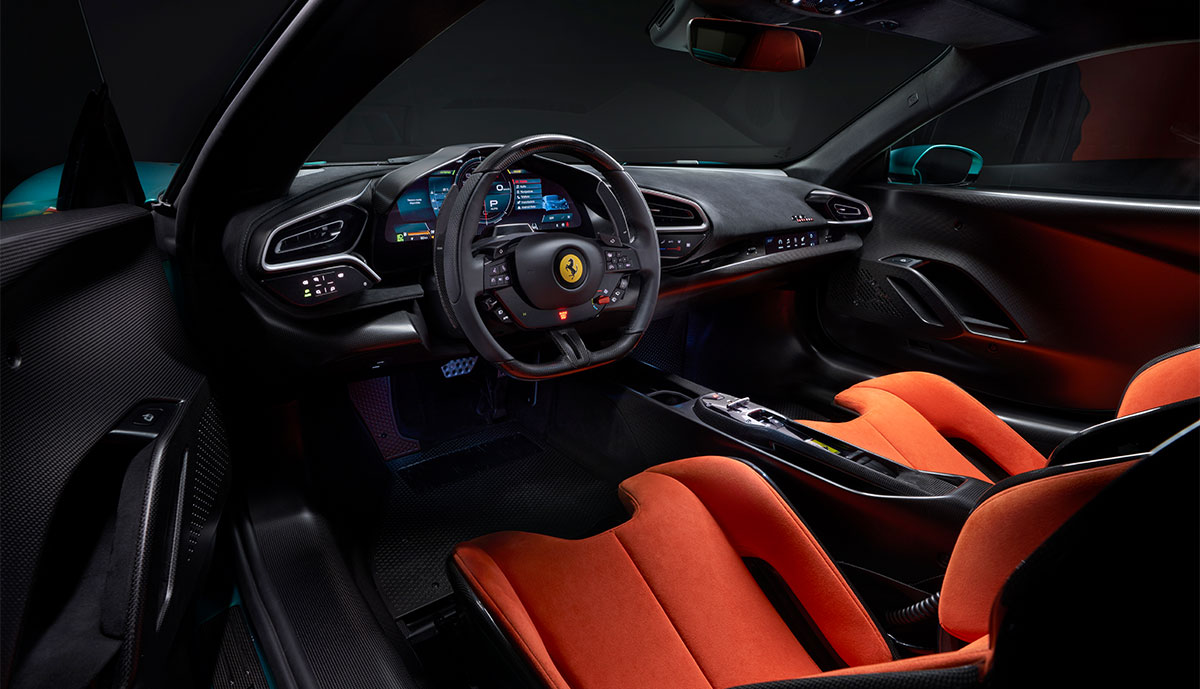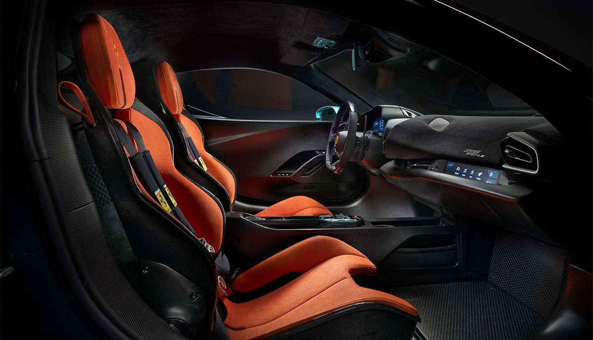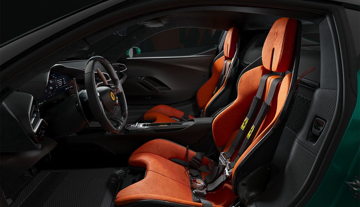 Das Cockpit wurde überarbeitet, um das Gewicht zu minimieren, mit neuen Sitzen, die fünf Kilogramm leichter sind als die des 296 GTB. Es gibt mehr Karbonfasern als zuvor, einschließlich einer neuen einteiligen Türverkleidung. Das neue Lenkrad tauscht die berührungsempfindlichen Bedienfelder des Vorgängers gegen traditionelle Tasten aus.