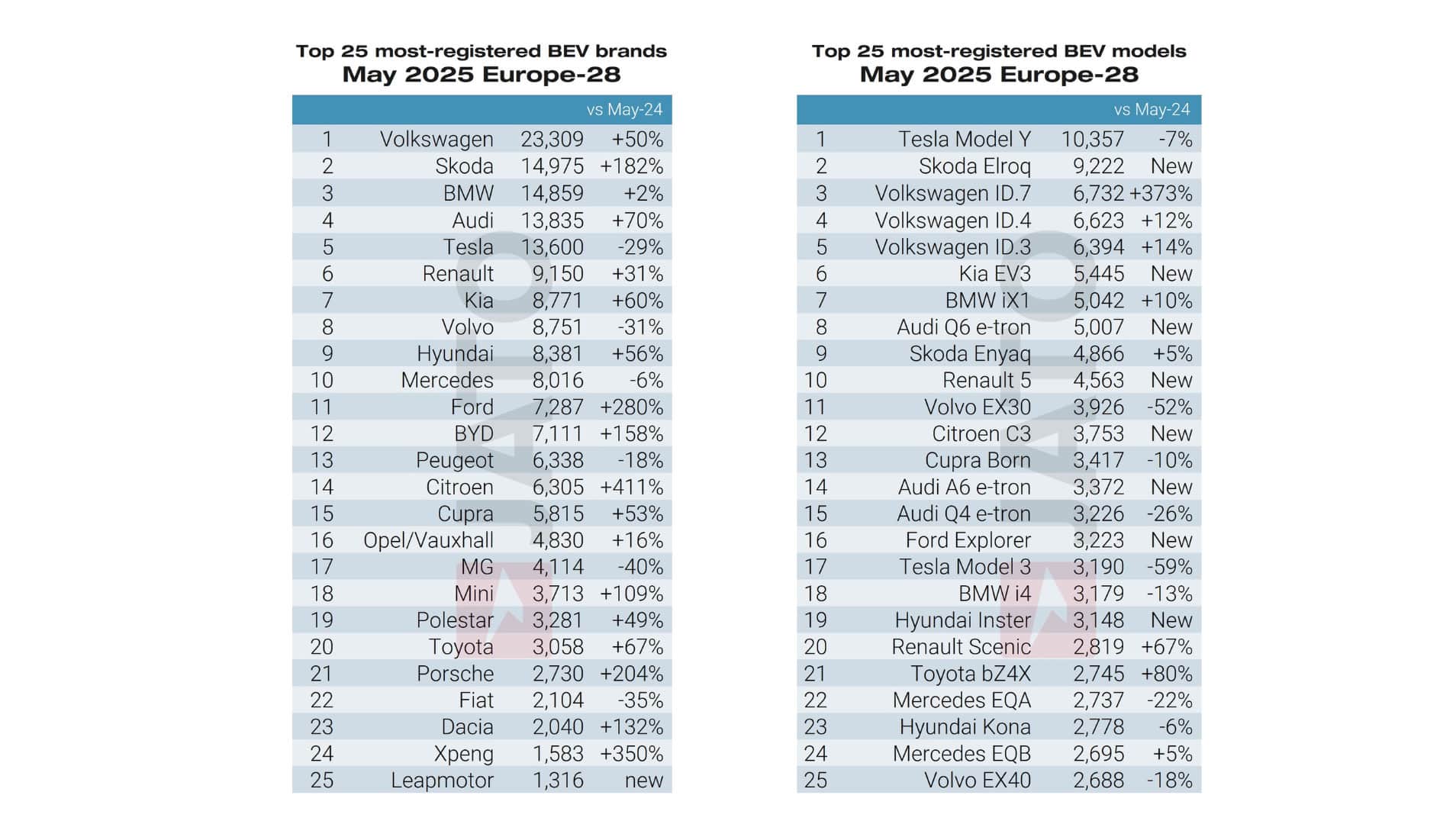 Die englische, heute in chinesischem Besitz befindliche Marke MG konnte die Zulassungen im Mai um 30 Prozent steigern und mit 133.400 Fahrzeugen Fiat (125.300) im bisherigen Jahresverlauf überholen. Der chinesische Stromerhersteller BYD wuchs im Jahresvergleich um 397 Prozent, lag im Mai aber knapp hinter Tesla, nachdem man den US-Konkurrenten im April erstmals übertroffen hatte.