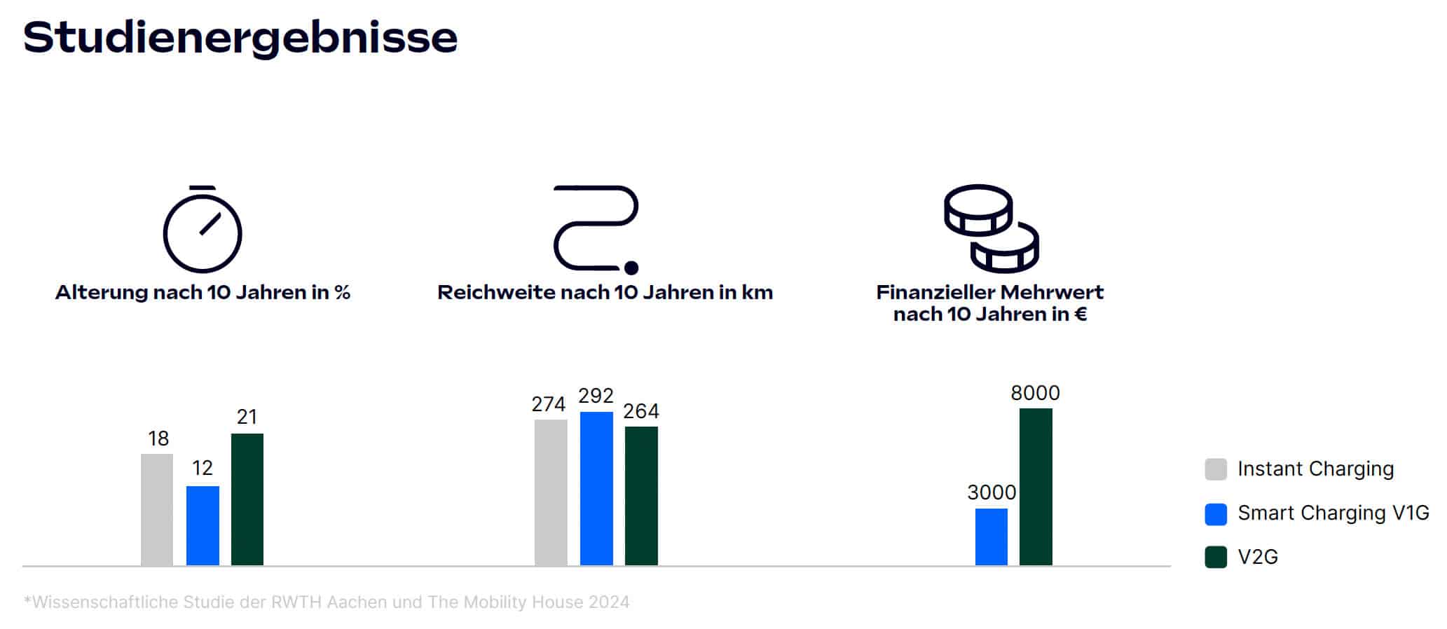 V2G ermöglicht es E-Fahrzeugen, Energie auch wieder ins Stromnetz einzuspeisen. Dies führt der Studie zufolge zwar zu einer zusätzlichen Alterung von 1,7 bis 5,8 Prozentpunkten, doch der Nutzen überwiegt. Pro Jahr kann eine Batterie damit rund 600 Euro einbringen. Der jährliche zusätzliche Energiedurchsatz lag in der Simulation bei 4,70 MWh für eine 52-kWh-Batterie. Der damit verbundene Kapazitätsverlust entspricht Investitionskosten von etwa 100 bis 300 Euro.