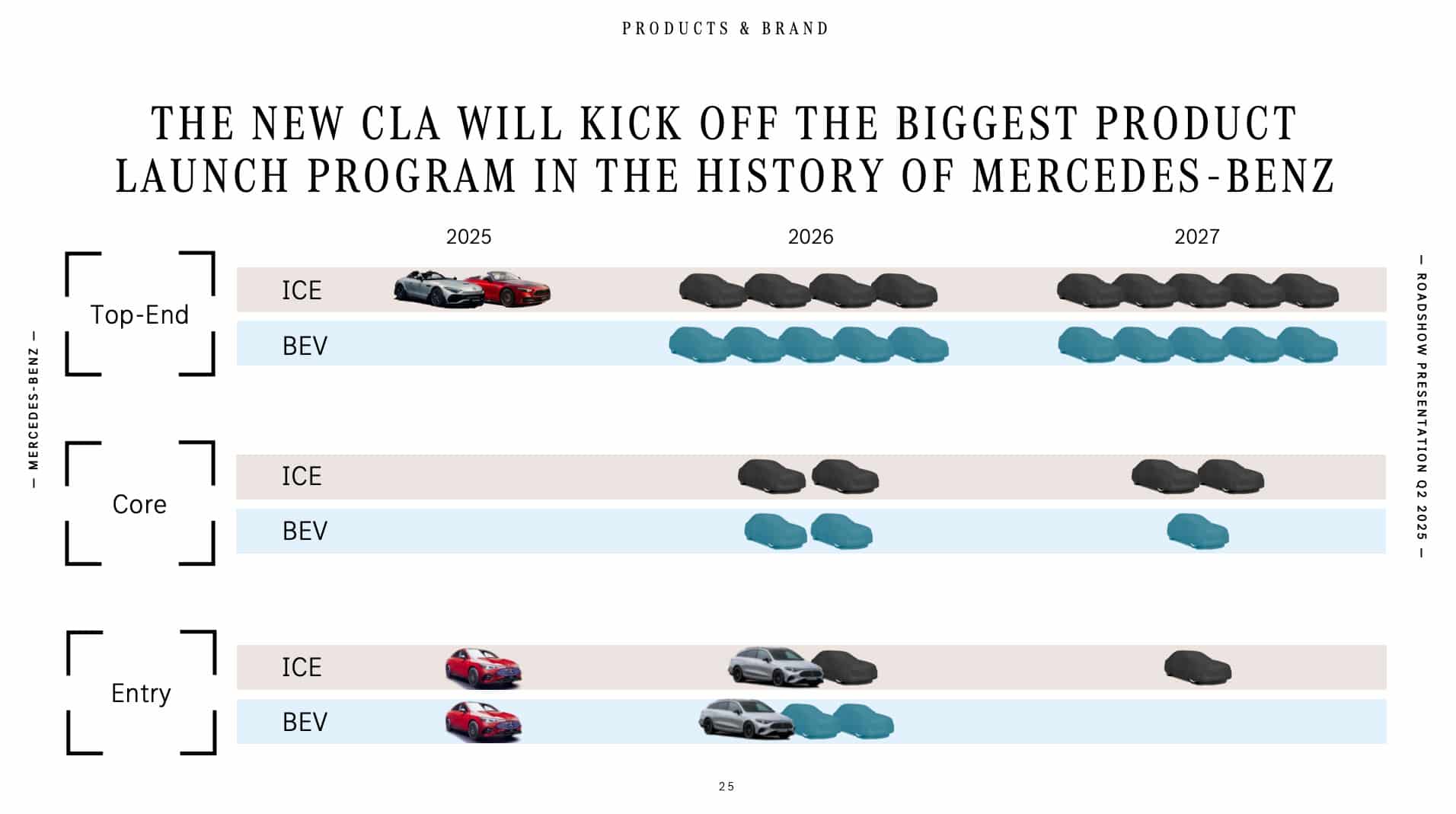 Zu sehen ist auf einer Folie der Präsentation, dass im Mercedes-Segment „Entry“ zwei neue Vollstromer kommen sollen. Bereits bekannt ist der schon bestellbare neue CLA als erstes Modell auf der vorrangig für Elektroautos konzipierten, aber auch noch Hybride erlaubenden Plattform MMA (Mercedes Modular Architecture). 2026 folgt die Shooting-Brake-Variante des Elektro-CLA. Zwei Platzhalter für weitere neue Modelle im nächsten Jahr lassen keinen Rückschluss auf die Fahrzeuge zu. Wahrscheinlich sind aber die nächsten Generationen der Batterie-Ausführungen der kompakten SUV GLA und GLB.