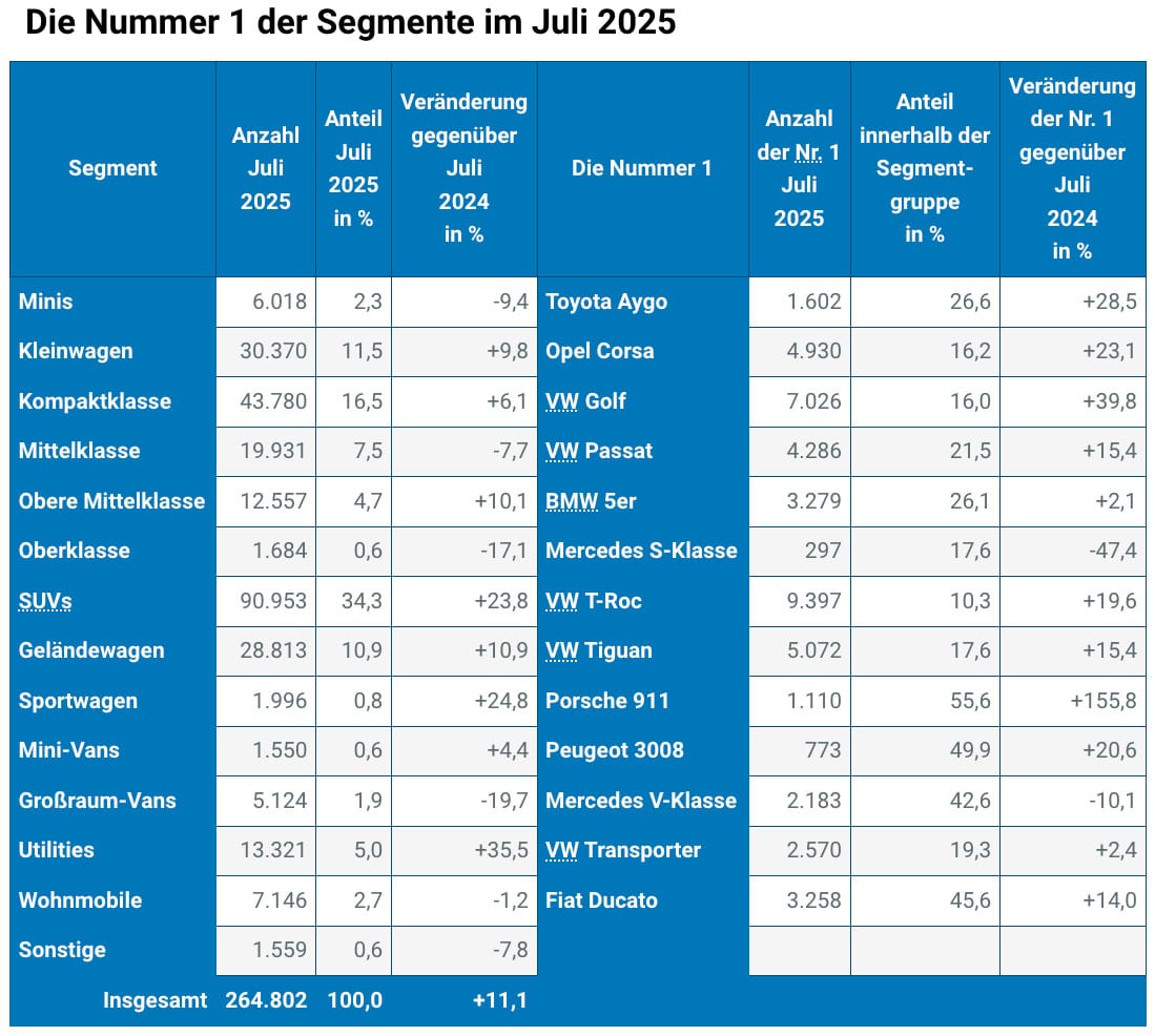 Das Kraftfahrt-Bundesamt (KBA) hat eine Auswertung zu der Nummer 1 der Segmente und der Nummer 1 der alternativen Antriebsarten im Juli 2025 veröffentlicht.