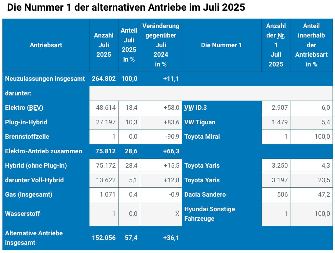 „Unter den zulassungsstärksten Modellen nach alternativen Antriebsarten gab es gegenüber dem Vormonat eine Veränderung: Bei der Antriebsart Wasserstoff konnten beim Hersteller Hyundai „Sonstige Fahrzeuge“ die meisten Neuzulassungen im Juli 2025 verzeichnet werden.“