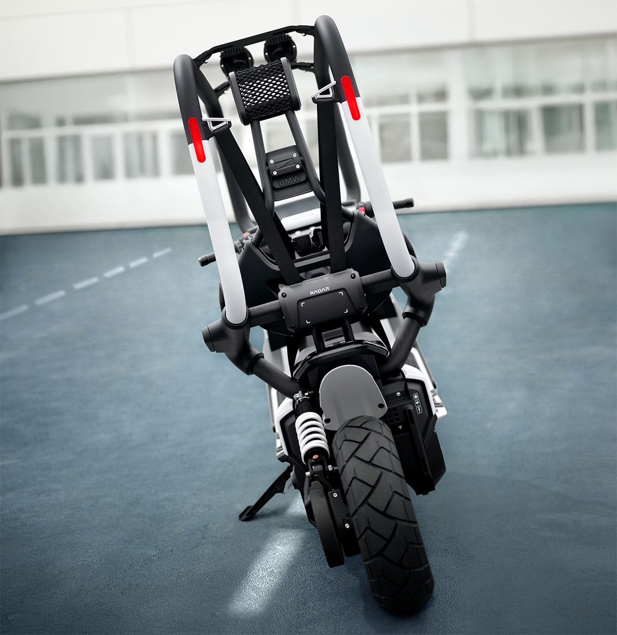 Herzstück des BMW Motorrad Vision CE ist sein Sicherheitskonzept, bestehend aus einem Metallrohrverbund – dem sogenannten Cage. Zusammen mit einer entsprechenden Sitzkonstruktion mit Gurt schafft er die notwendigen Voraussetzungen, um das Fahrerlebnis ohne Helm und übliche Funktionskleidung sicher zu gestalten.