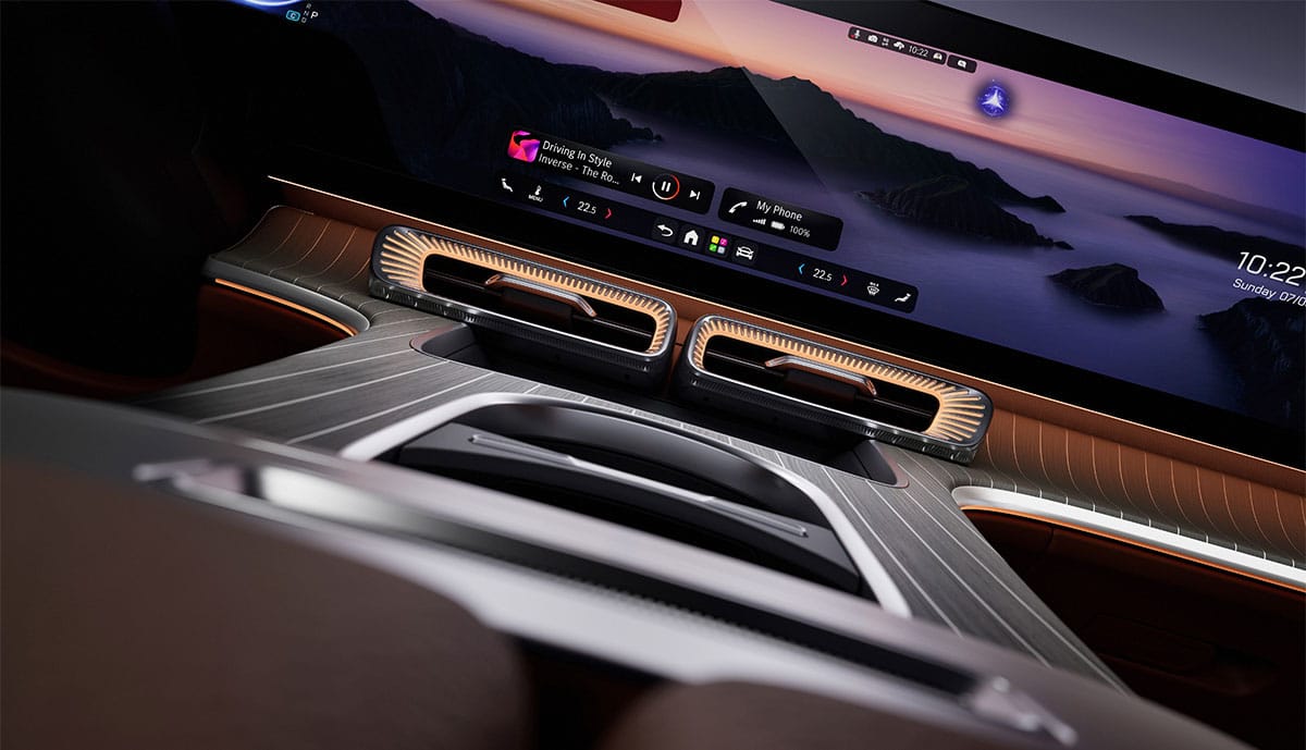 Das Herzstück des Cockpits ist der neue nahtlose „MBUX Hyperscreen“. „Er hebt das Innenraumerlebnis auf ein nie dagewesenes Niveau und schafft einen Raum, der sich sowohl intuitiv als auch einladend anfühlt“, werben die Schwaben. „Der majestätisch schwebende Bildschirm vermittelt ein Gefühl der Zugehörigkeit und verkörpert das ‚Welcome home‘-Gefühl, das schon das Einsteigen in einen Mercedes-Benz auslösen kann.“