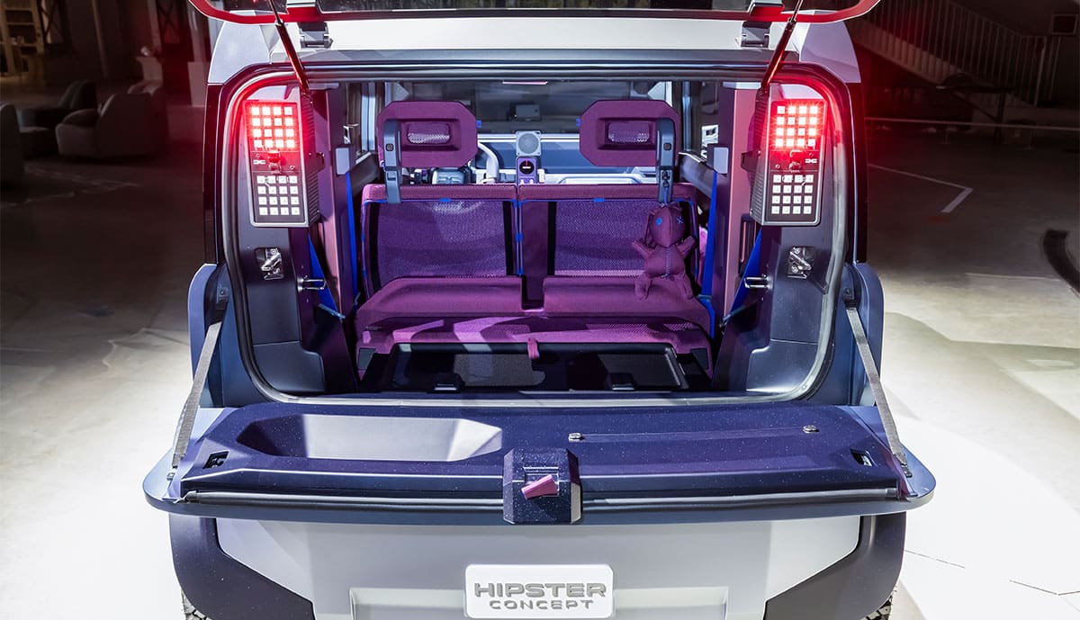 „Unser Ziel bei der Neugestaltung des echten Volksautos war es, ein unverwechselbares und einprägsames Design zu schaffen. Ein Auto, das mit drei Bleistiftstrichen skizziert werden kann“, sagt Romain Gauvin, Leiter Advanced Design & Exterior Design. Der Hipster Concept zeigt entsprechend ein sehr schlichtes und robustes Design: Ein Block, der auf vier Rädern an den vier Ecken sitzt. Es gibt weder vorne noch hinten einen Überhang. Im Heckbereich steht die Funktionalität im Vordergrund: Die Heckklappe erstreckt sich über die gesamte Breite und lässt sich in zwei Teilen öffnen, um den Zugang zum Kofferraum einfach zu gestalten.