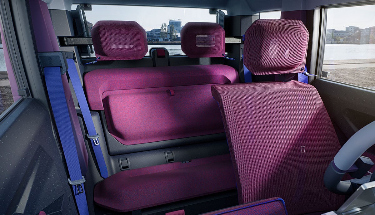 Der Innenraum folgt den kubischen Formen der Karosserie. Insbesondere mit den sehr vertikalen Fenstern und Windschutzscheibe, um den verfügbaren Platz möglichst gut zu nutzen. Der verglaste vordere Teil des Daches sorgt für mehr Licht und trägt zum Raumgefühl bei. Um Kosten und Gewicht zu reduzieren, handelt es sich bei den Seitenfenstern um Schiebefenster.