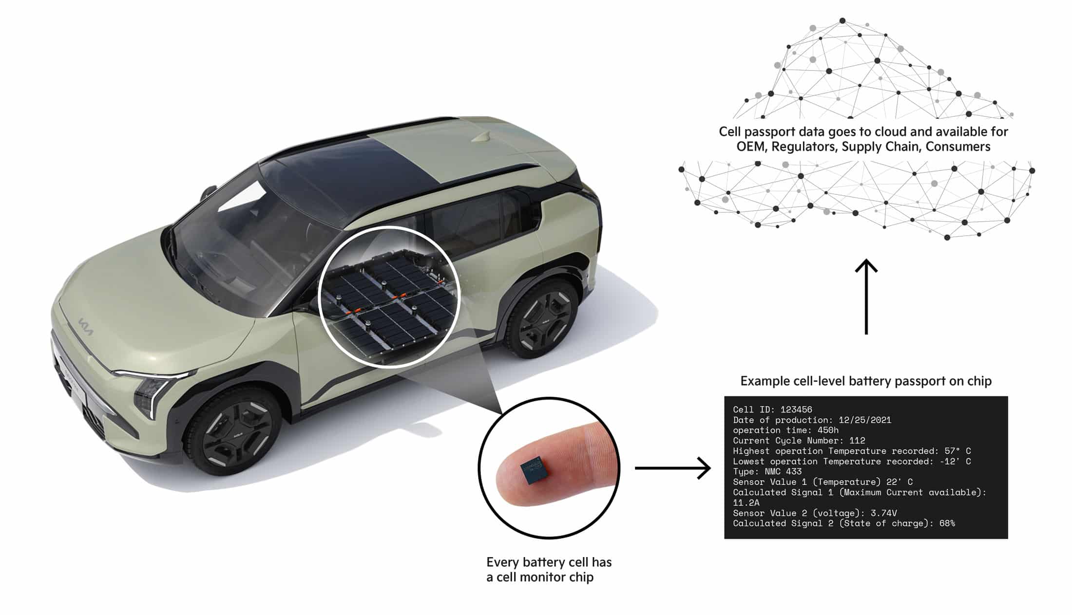Für den aktuellen Test wurde ein Kia EV3 mit einem Batteriezellen-Überwachungssystem von Dukosi aus Korea nach Deutschland gebracht. Das Fahrzeug kann Live-Daten jeder einzelnen Zelle seines Batteriepakets erfassen, übertragen und in den digitalen Batteriepass einspeisen. Über das Infotainmentsystem können Nutzer, Mechaniker und Behörden den aktuellen Zustand der Batterie abrufen. Nach jeder Reparatur aktualisiert sich das System automatisch, um die Nachverfolgbarkeit über den gesamten Lebenszyklus zu gewährleisten.