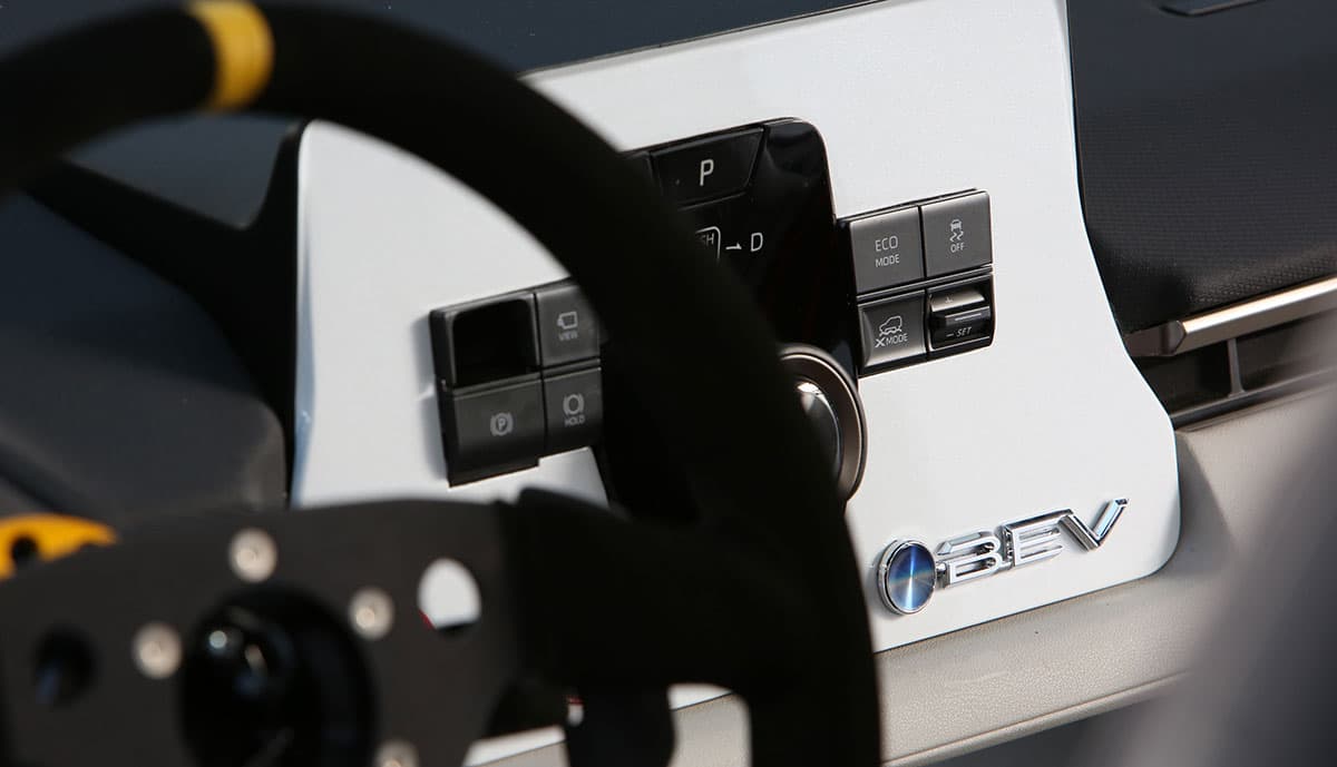 Der Innenraum ist auf Rennbetrieb ausgelegt: FIA-zertifizierte Chromoly-Sicherheitszelle, OMP-Rennsitze und Sechspunktgurte. 19-Zoll-BBS-Felgen mit 305er Continental-Reifen sorgen für hohe Traktion. Zusammen mit dem laut Toyota aufwendig entwickelten Aero-Kit ergibt sich ein Elektroauto, das sowohl optisch als auch technisch auf Wettbewerb getrimmt ist.