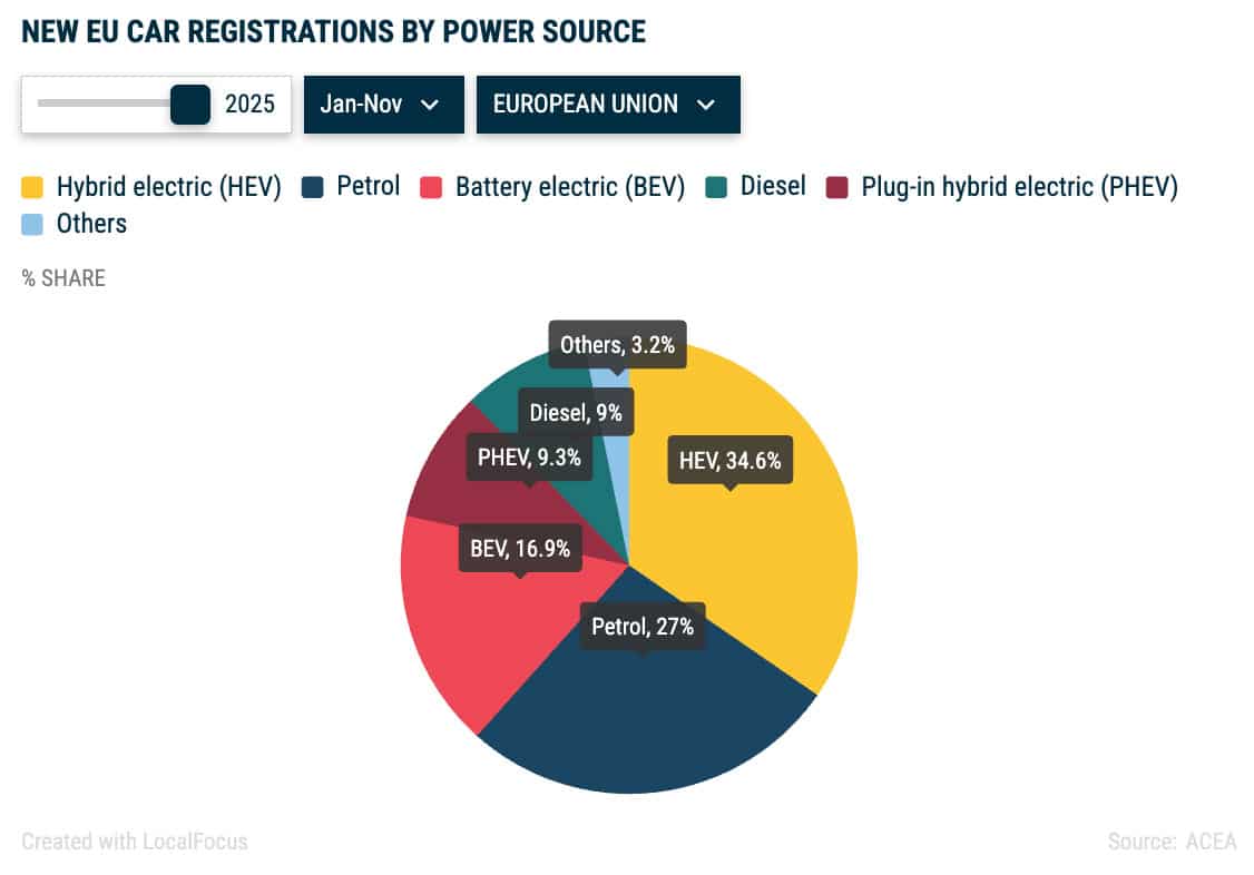 Hybridfahrzeuge erreichten im gleichen Zeitraum 3.408.907 Neuzulassungen und sichern sich mit 34,6 Prozent weiterhin den größten Marktanteil. Angetrieben wurde das Wachstum insbesondere durch Spanien (+26 %), Frankreich (+24,2 %), Deutschland (+8,7 %) und Italien (+7,9 %).
