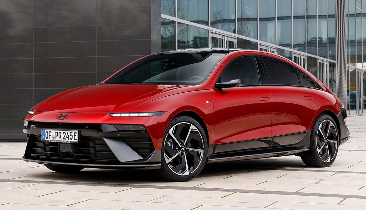 Die sportliche Variante N Line ist mit 20-Zoll-Leichtmetallfelgen, N-Line-Exterieur und -Interieur mit 84-kWh-Batterie und entweder Heck- oder Allradantrieb ab 58.300 Euro erhältlich. Als Hecktriebler liefert der Motor 168 kW/229 PS, in der Allradversion sind es 239 kW/325 PS. „Die N Line betont den sportlichen Charakter des Fahrzeugs zum einen durch sein Außendesign mit speziellen Leichtmetallfelgen und zum anderen durch die exklusive Stoff-Leder-Polsterung der Sitze mit roten Ziernähten und roten Applikationen im Innenraum“, wirbt Hyundai. Für den Ioniq 6 N Line können zusätzlich ein Glas-Schiebedach für 700 Euro oder das Technik-Paket für 2.600 Euro erworben werden.