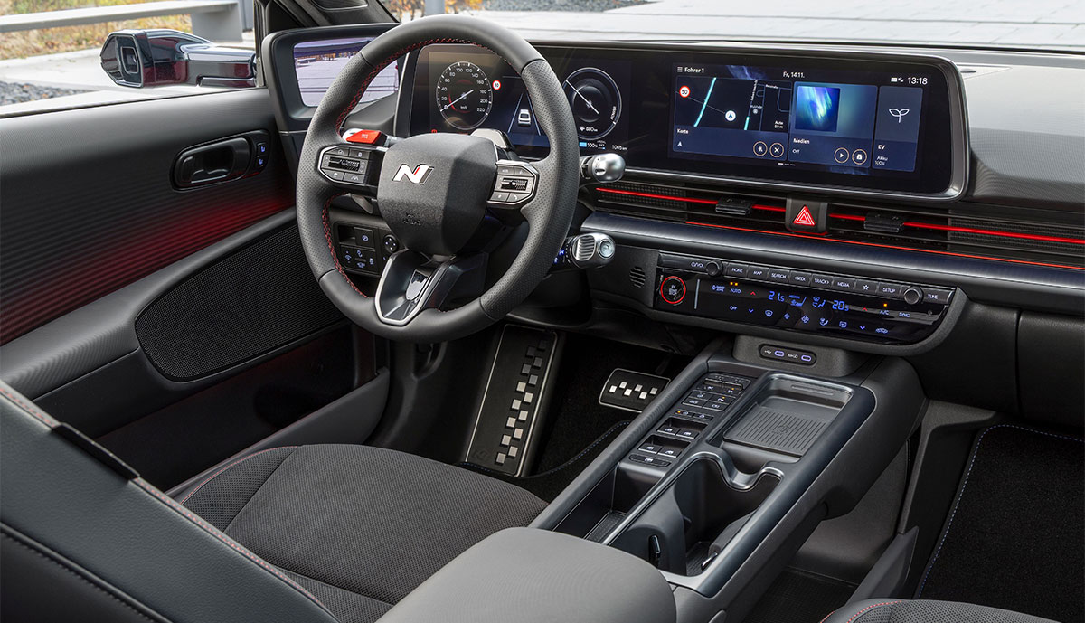 Die N Line X als nahezu vollausgestattete Variante bietet zusätzlich zur N Line das Bose-Soundsystem, eine 360-Grad-Kamera, ein Head-up-Display, ein mit LED-Pixeln beleuchtetes Lenkrad sowie eine Sitzpolsterung in Alcantara-Leder-Kombination. Die Preise starten bei 62.000 Euro für die Variante mit 84-kWh-Batterie und Heckantrieb und 65.250 Euro für den Allradantrieb. Optional erhältlich sind ein Glas-Schiebedach für 700 Euro sowie digitale Außenspiegel für 1.300 Euro.
