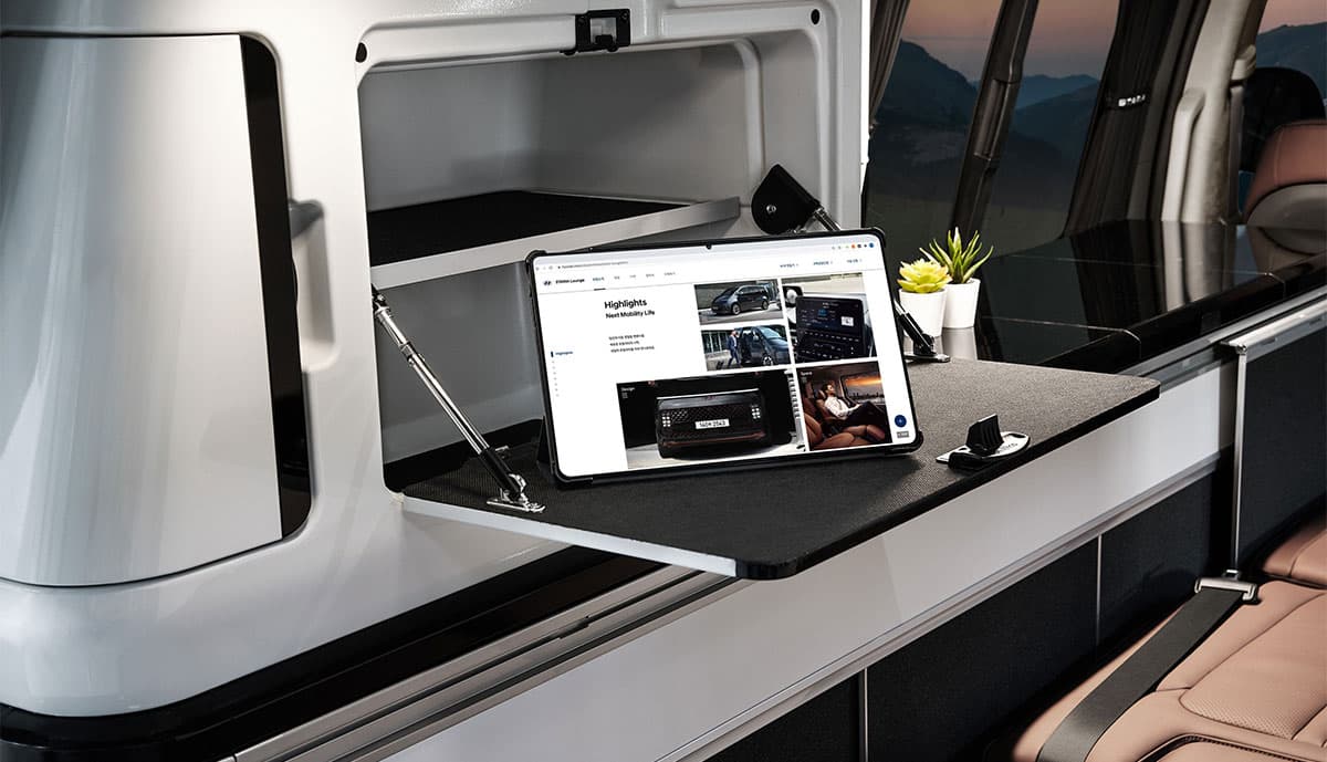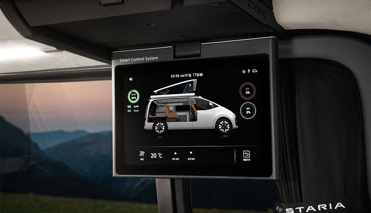 Um die Privatsphäre, Sicherheit und den allgemeinen Komfort während der Fahrt oder beim Ausruhen zu verbessern, wird beim Staria Camper Concept der Einsatz von elektronisch verstellbarem „Smart Glass“ im hinteren Teil der Kabine geprüft. Das System wird über ein spezielles Touchscreen-Modul gesteuert und ermöglicht die sofortige Einstellung der Transparenz und Tönung, während es im Vergleich zu herkömmlichem Glas eine deutlich verbesserte UV-, Wärme- und Schalldämmung bieten soll.
