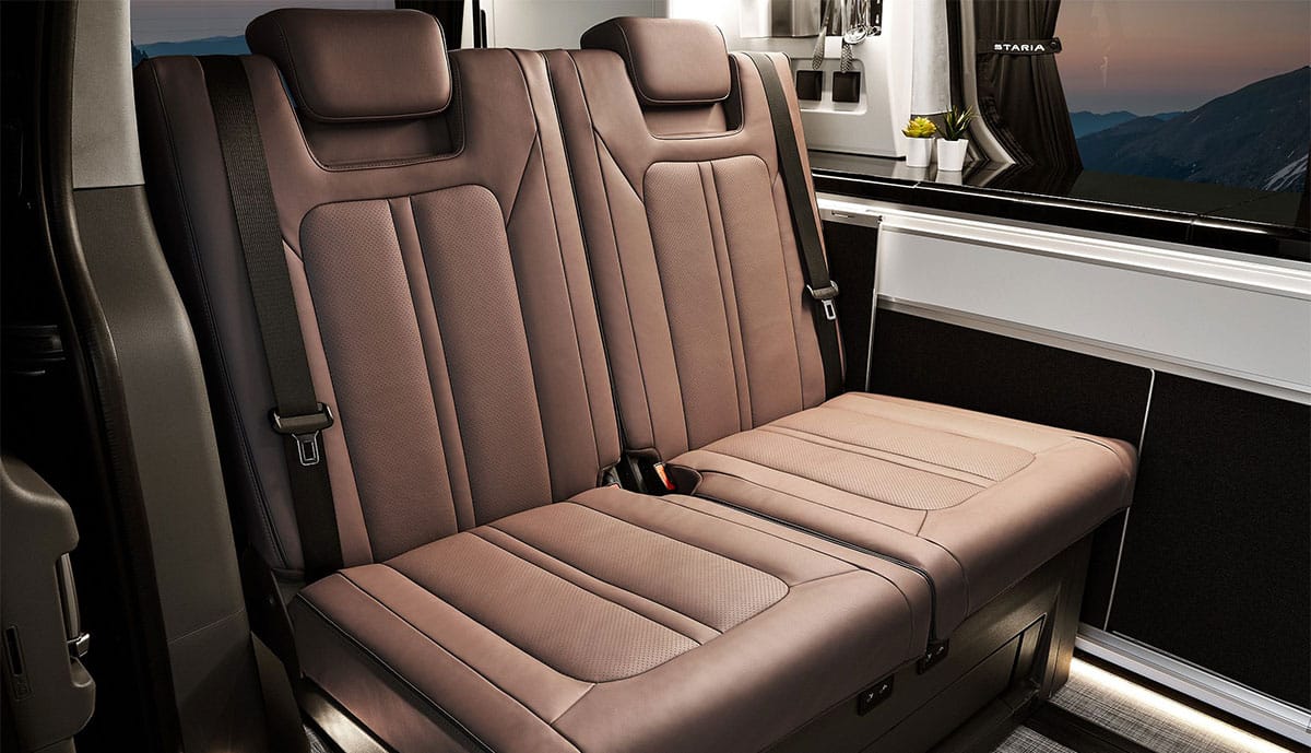 Ein charakteristisches Merkmal sei das vollständig integrierte, elektrisch betätigte Aufstelldach, das im geparkten Zustand einen helleren, offeneren Wohnraum schaffe und den Zugang zum Küchenbereich verbessere. Das Aufstelldach sei so konstruiert, dass es die aerodynamische Effizienz des Staria bewahrt und gleichzeitig Windgeräusche und Turbulenzen während der Fahrt reduziert. Es sei aus dem gleichen hochwertigen Material in Wagenfarbe gefertigt wie der Rest des Daches und lasse sich mühelos per Knopfdruck hoch- und herunterfahren.