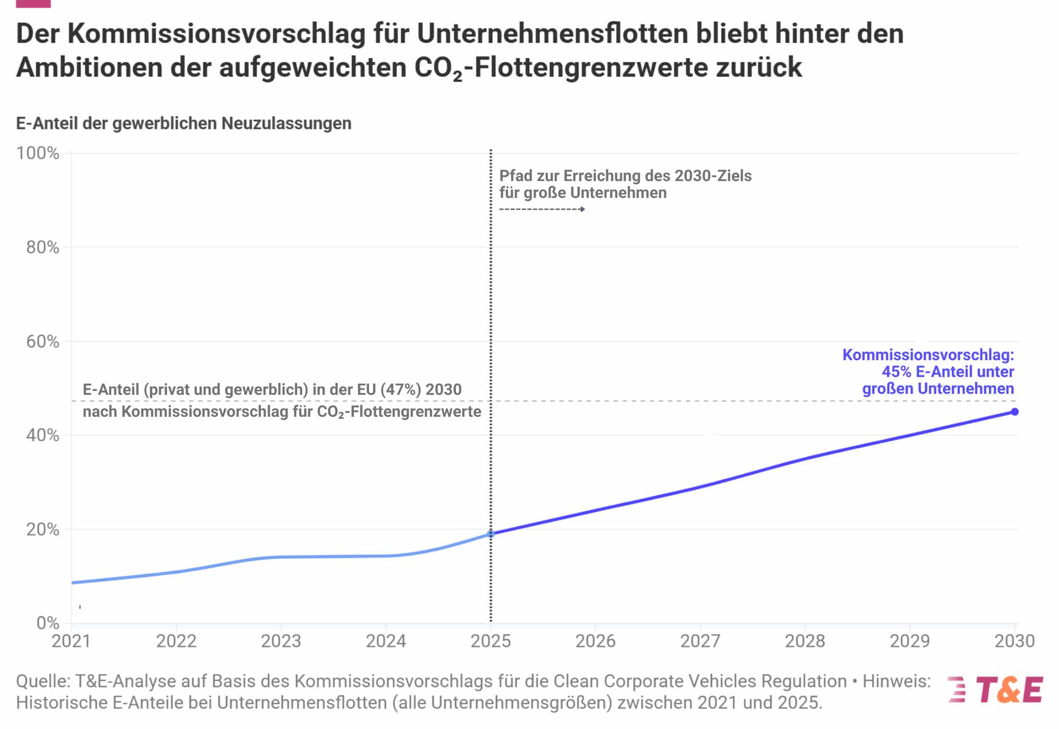 Die von der EU-Kommission vorgeschlagenen Elektrifizierungsziele für große Unternehmensflotten bedeuten kein „Verbrenner-Aus durch die Hintertür“, wie von Teilen der Industrie behauptet. Zu diesem Ergebnis kommt eine Analyse der Umweltorganisation Transport & Environment (T&E). Sie zeige, dass die Unternehmensflottenziele selbst hinter den Ambitionen der aufgeweichten CO2-Flottengrenzwerte zurückblieben. Gleichzeitig werde deutlich, dass vor allem deutsche Hersteller und der deutsche Automobilstandort von einer schnellen Elektrifizierung der Unternehmensflotten profitieren würden.