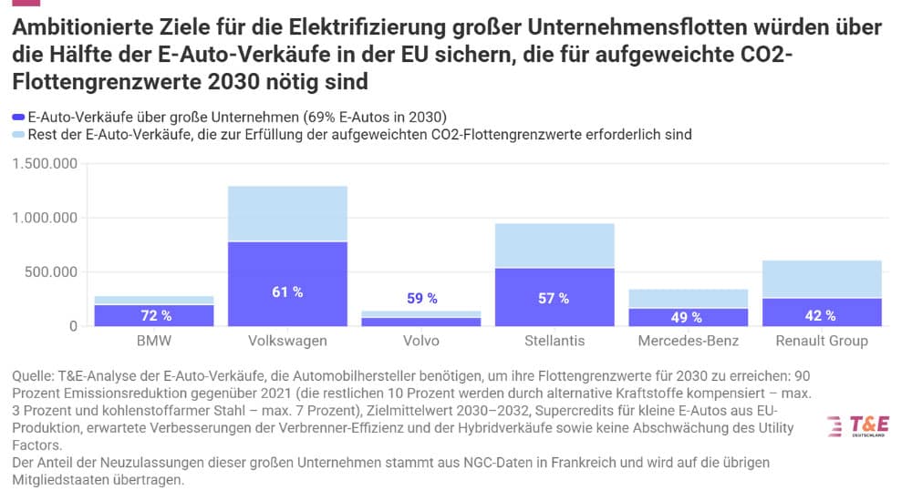 Ein Großteil der in Europa zugelassenen elektrischen Firmenwagen wird in deutschen Werken produziert, und deutsche Hersteller verkaufen einen erheblichen Teil ihrer Neuwagen als Firmenwagen. „Eine ehrgeizigere Elektrifizierung von großen Unternehmensflotten käme nicht nur deutschen Herstellern und deutschen Werken, sondern nicht zuletzt dem Klima zugute“, sagt T&E.