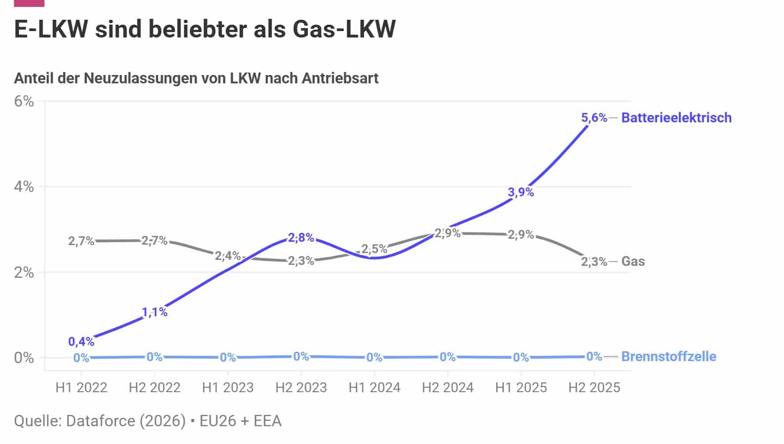 Besonders stark zog der elektrische Markt im Jahr 2025 an: Nachdem die ersten CO2-Zwischenziele durch die EU-Flottengrenzwerte für Lkw in Kraft traten, erreichten E-Lkw im zweiten Halbjahr 2025 einen Marktanteil von 5,6 Prozent in Europa. Damit haben E-Lkw einen doppelt so hohen Marktanteil wie Gasfahrzeuge, deren Nachfrage stagniert. Wasserstoff-Brennstoffzellen-Lkw bleiben mit einem Marktanteil von weniger als 0,1 Prozent eine Nischentechnologie. Die Nachfrage nach Diesel-Lkw sank im Zeitraum 2023 bis 2025 um 16 Prozent.