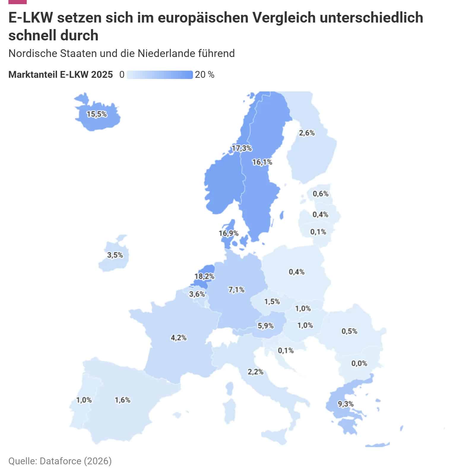 Laut der Analyse liegt Europa bei der Einführung von Elektro-Lkw zwei bis drei Jahre hinter China zurück. Dort waren 2025 bereits 15 Prozent der neu zugelassenen Lkw elektrisch. Europäische Hersteller drohen dadurch, den Technologiewettbewerb gegen China zu verlieren. Mit den chinesischen Verkaufszahlen konnten im letzten Jahr lediglich die europäischen Spitzenreiter Niederlande (18,2 %), Norwegen (17,3 %), Dänemark (16,9 %) und Schweden (16,1 %) mithalten. Deutschland liegt mit 7,1 Prozent deutlich dahinter, aber immer noch leicht über dem europäischen Durchschnitt von 5,6 Prozent.