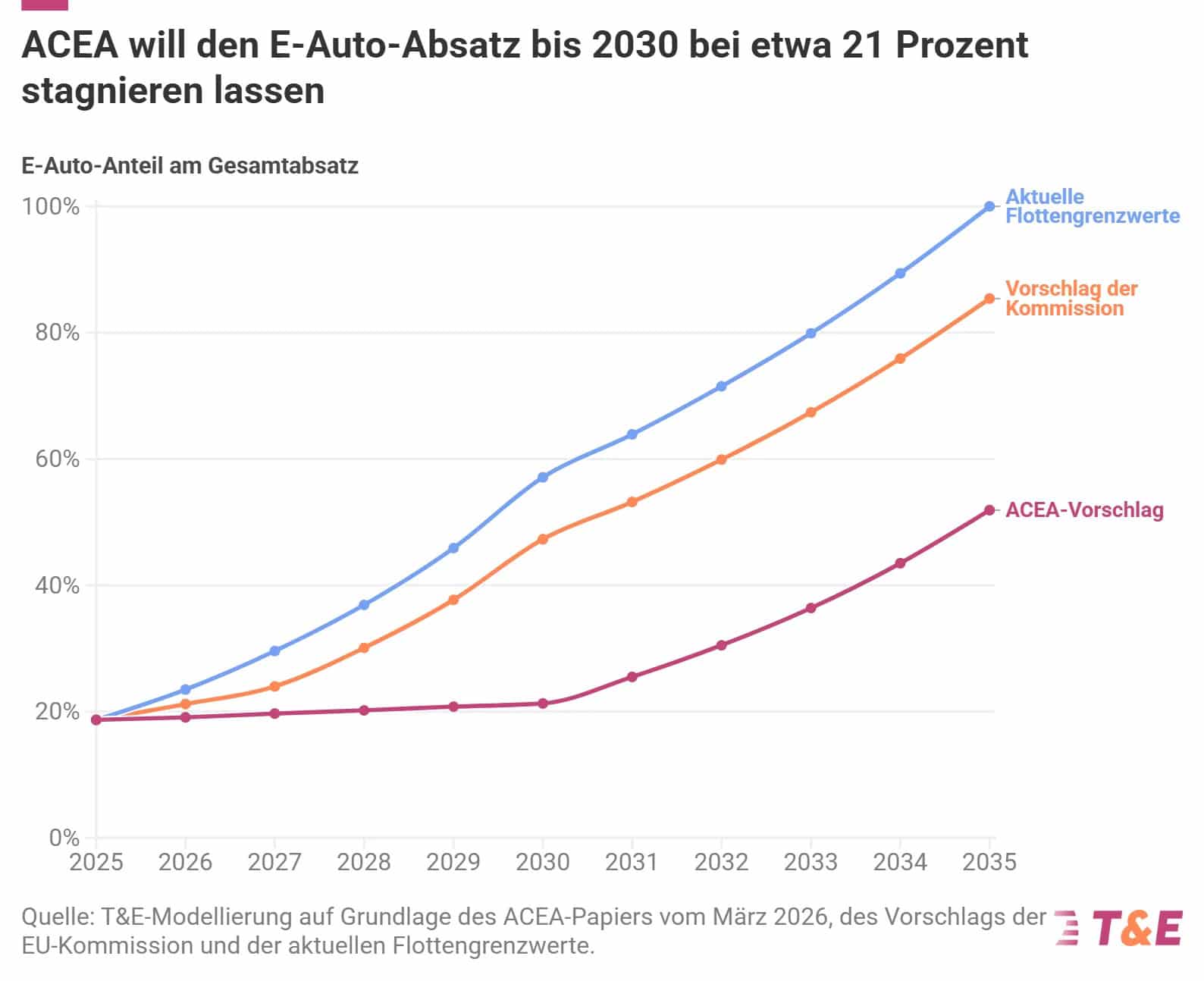 Im Dezember schlug die EU-Kommission vor, das Ziel der Hersteller für 2035 von einer 100-prozentigen CO2-Reduzierung auf 90 Prozent abzusenken. Der Verband ACEA fordert eine weitere Absenkung auf 80 Prozent, durch Gutschriften in Höhe von 10 Prozent ohne Auflagen, sowie weitere 5 Prozent für Kraftstoffe, die weniger CO2 ausstoßen als Benzin, und 5 Prozent für kohlenstoffarme Materialien. T&E hat berechnet, dass der Anteil der E-Auto-Verkäufe 2035 dadurch nur 52 statt 100 Prozent betragen könnte. Die Kraftstoffgutschriften würden es den Autoherstellern ermöglichen, weniger E-Autos zu verkaufen, als Gegenleistung für nicht vorhandene Emissionseinsparungen.