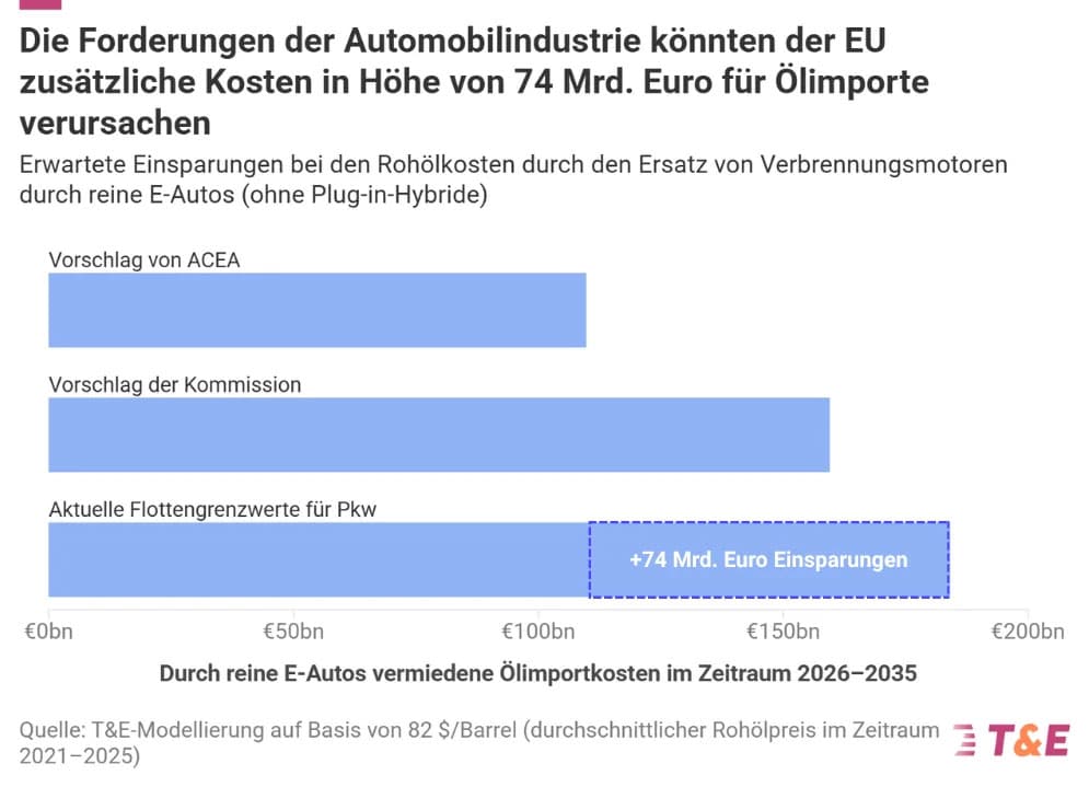 Der ACEA-Vorschlag könnte laut T&E der EU zwischen 2026 und 2035 zusätzliche Kosten in Höhe von 74 Milliarden Euro für Ölimporte verursachen, weil weniger E-Autos den Rohöl-Bedarf weniger senken. Im Vergleich zur aktuellen Regelung könnten sich die CO2-Emissionen europäischer Autos zwischen 2026 und 2050 um bis zu 2,4 GtCO₂ erhöhen. Das entspricht den Emissionen der heutigen EU-Fahrzeugflotte über einen Zeitraum von mehr als fünf Jahren.