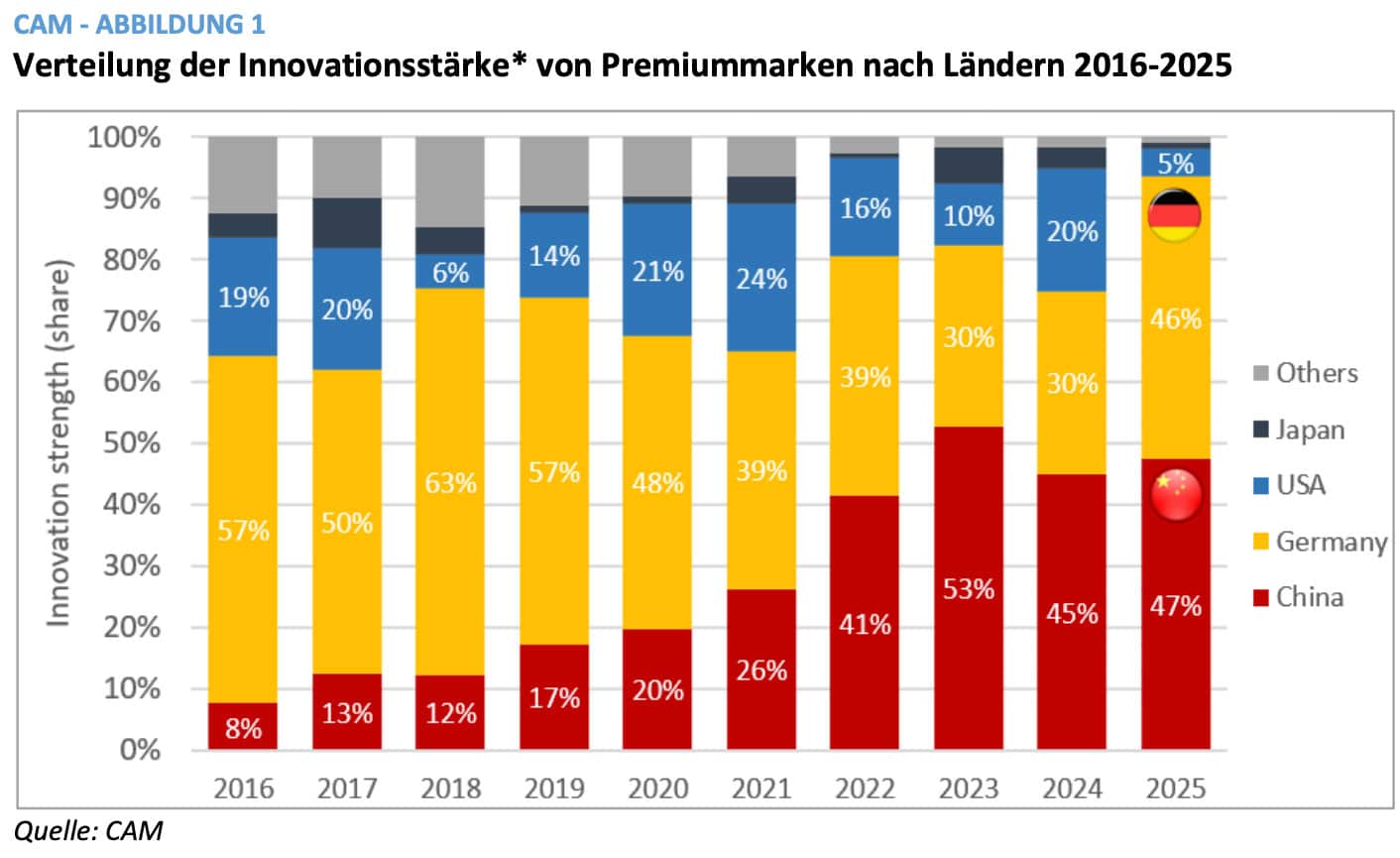 Der Langzeitvergleich der Innovationsstärke von Premiumautomarken nach Ländern zeigt die umbruchartige Verschiebung: Während noch bis Ende der 2010er-Jahre die deutschen Premiumhersteller mit rund 60 Prozent der weltweiten Innovationsstärke den Premiumbereich dominierten, ging dieser Anteil in Folgezeit stark zurück. Umgekehrt steigt die Innovationsstärke chinesischer Premiumhersteller von niedrigen zweistelligen Anteilen auf fast die Hälfte der weltweiten Innovationsstärke bis Mitte der 2020er-Jahre an. Im Jahr 2025 können die deutschen Premiumhersteller ihren Innovationsanteil erstmals wieder signifikant auf 46 Prozent steigern, während vor allem US-amerikanische Premiummarken an Bedeutung verlieren.