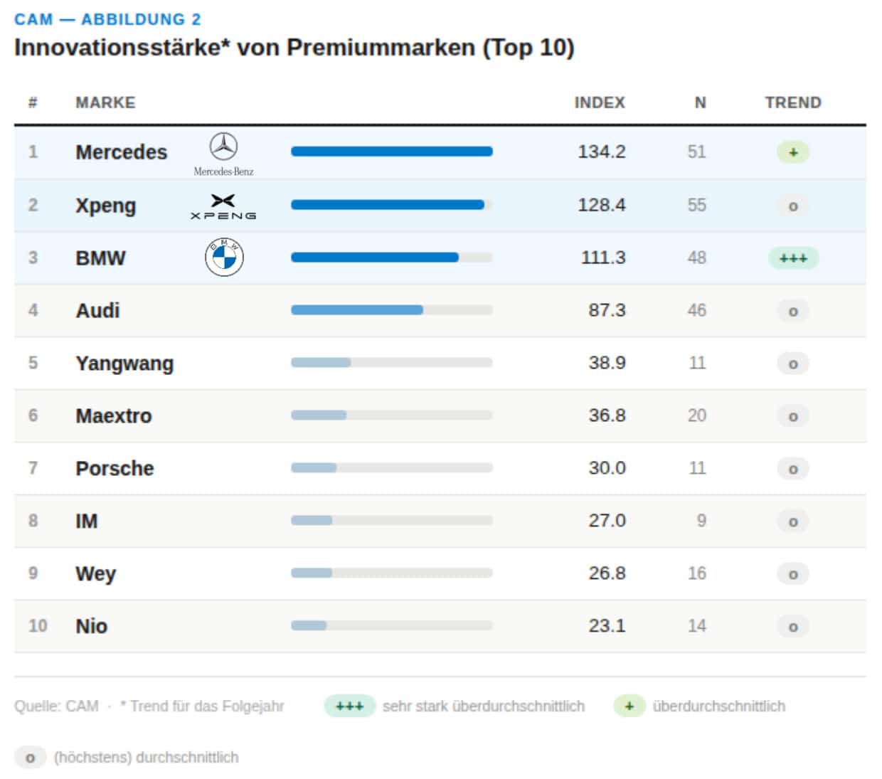 Mercedes-Benz punktet bei Innovationen etwa mit dem neuen, vorrangig als Elektroauto konzipierten CLA, der den niedrigsten Stromverbrauch, die höchste Segment-Reichweite und die höchsten Ladeleistung in der Mittelklasse hat. Neu und auch im CLA verfügbar ist ein unterstützendes Assistenzsystem, das den Fahrer kooperativ etwa beim Spurhalten hilft und sich nicht bei einem manuellen Eingriff abschaltet. Innovationen von Mercedes stammen laut dem CAM auch aus dem Connectivity-Bereich: In mehreren Baureihen lassen sich nun E-Auto-Ladesäulen vorab reservieren, außerdem kann eine Autobahnvignette digital vom Fahrzeug aus erworben werden.