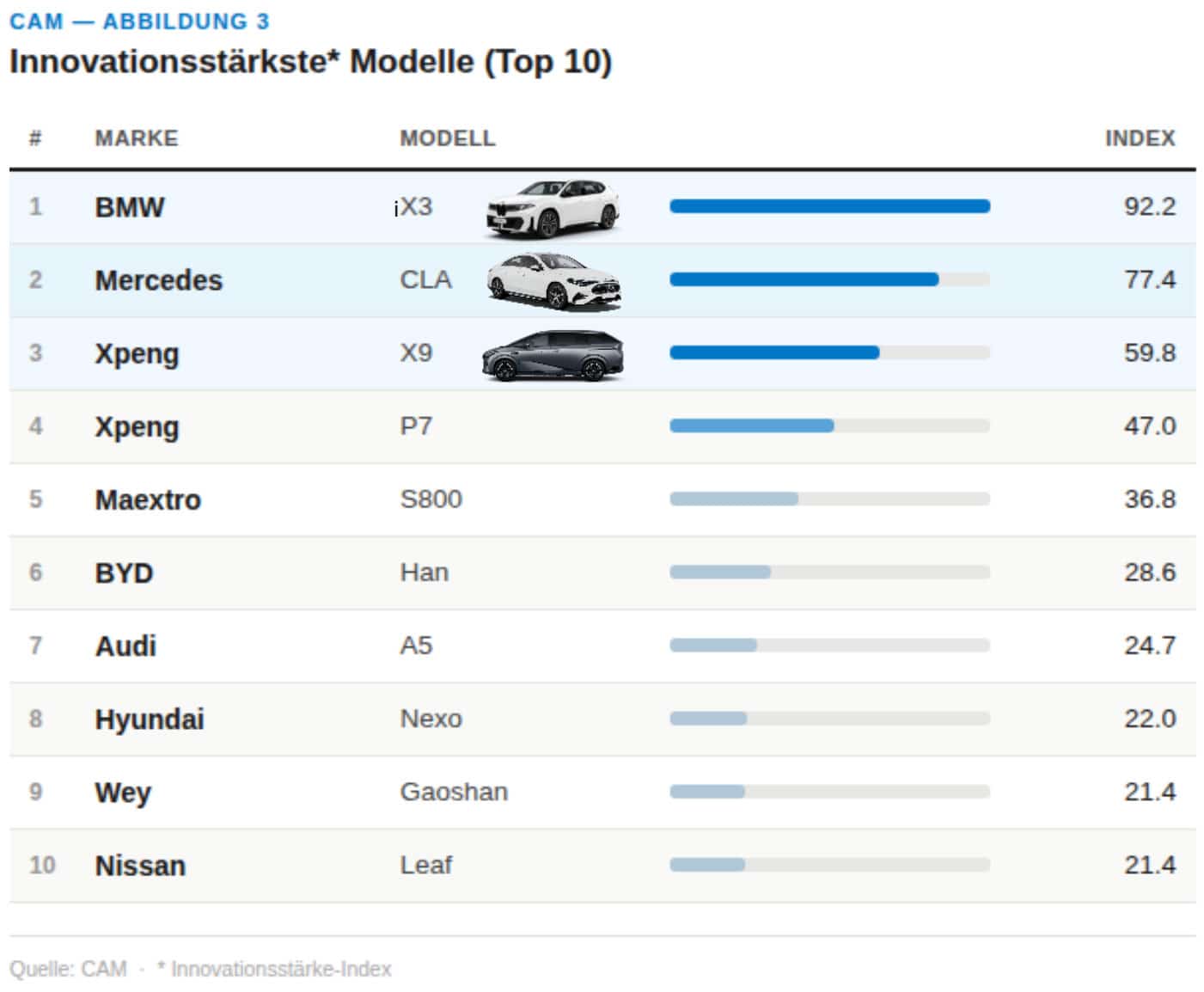 Ein Grund für das gute Abschneiden deutscher Premiummarken sind laut dem CAM einige innovationsstarke Modelle, die besonders viele Neuerungen auf sich vereinigen. So bringt die frisch eingeführte Neue-Klasse-Plattform von BMW direkt das innovationsstärkste Modell 2026 hervor: den jüngsten iX3, die neue Batterie-Version des SUV der gehobenen Mittelklasse. Damit erringt BMW diesen Preis das erste Mal wieder seit über zehn Jahren. Auf dem zweiten Platz folgt die CLA-Baureihe von Mercedes-Benz, auf dem dritten Rang rangiert der Van X9 von Xpeng. Insgesamt kommen fünf der zehn innovationsstärksten Premiummodelle des Jahres aus China.