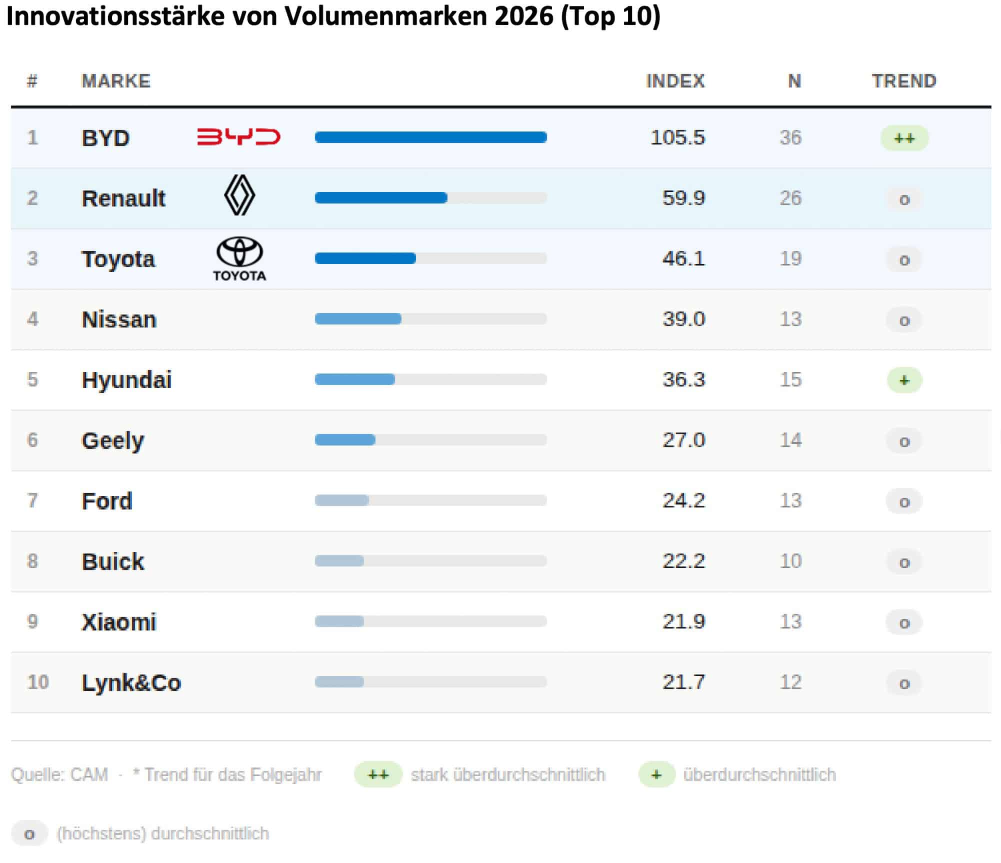 Neben der Konzernwertung wird die Marke BYD auch die Innovationsstärkste Volumenmarke 2026 mit über 105 Indexpunkten. Insbesondere Innovationen im Antriebsbereich (Batterietechnologie) und bei den Fahrerassistenzsystemen führten hierzu, erklärt das CAM. So sei BYD in der Lage, neue oder verbesserte Assistenzsysteme (Level 2+) zum Teil per OTA-Updates in praktisch allen Baureihen und Segmenten anzubieten, weil der Konzern konsequenter als viele europäische Marken in software-definierte Plattformen investiert habe. Dies zahle sich nun technologisch aus und bringe insbesondere im Heimatmarkt China viele neue Kunden.