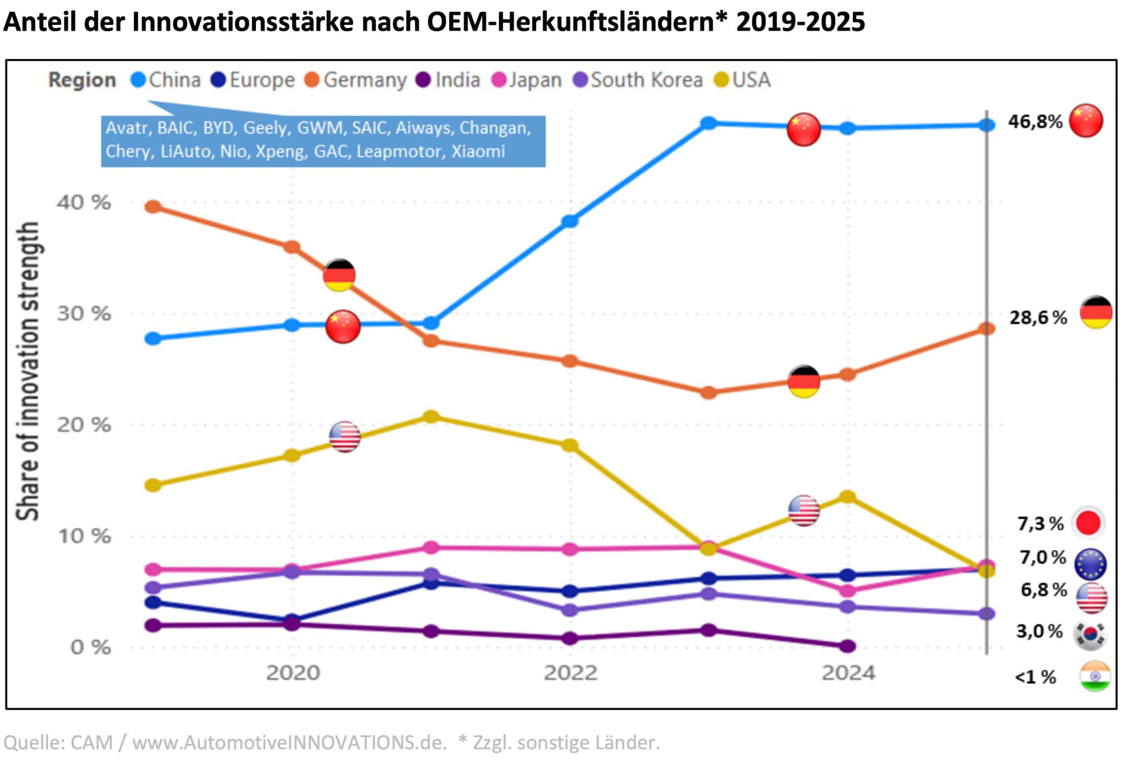 Die chinesischen Automobilkonzerne haben laut den Marktforschern des deutschen Center of Automotive Management (CAM) in den letzten Jahren kontinuierlich an Innovationsstärke gewonnen und standen in Summe bereits in den letzten Jahren ganz vorn. Erstmals seit der Premiere der „AutomotiveInnovations“-Studienreihe im Jahr 2005 wird jetzt aber mit BYD ein einzelner chinesischer Hersteller weltweit Innovationsstärkster Automobilkonzern, vor der Volkswagen Group und Mercedes-Benz.