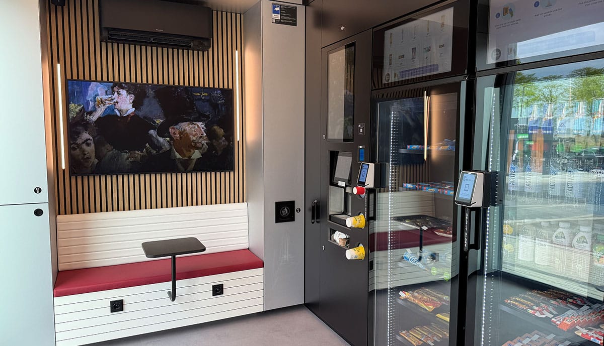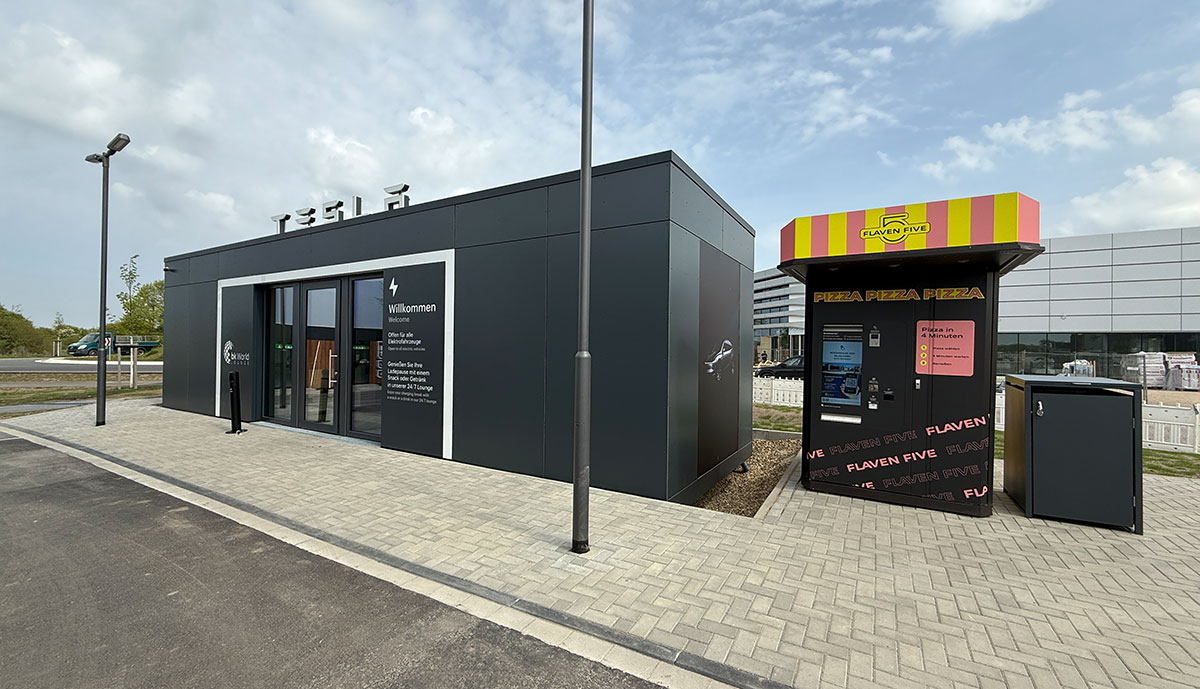 Zusätzlich gibt es einen 24/7-Pizzaautomaten, der Gästen eine warme Mahlzeit bietet. Neben der Lounge steht eine DHL-Packstation, sodass Pakete zum Ladepark geschickt und während des Ladevorgangs abgeholt werden können. Auf der anderen Seite der A44 befinden sich zudem Ladesäulen von EnBW und EWE Go.