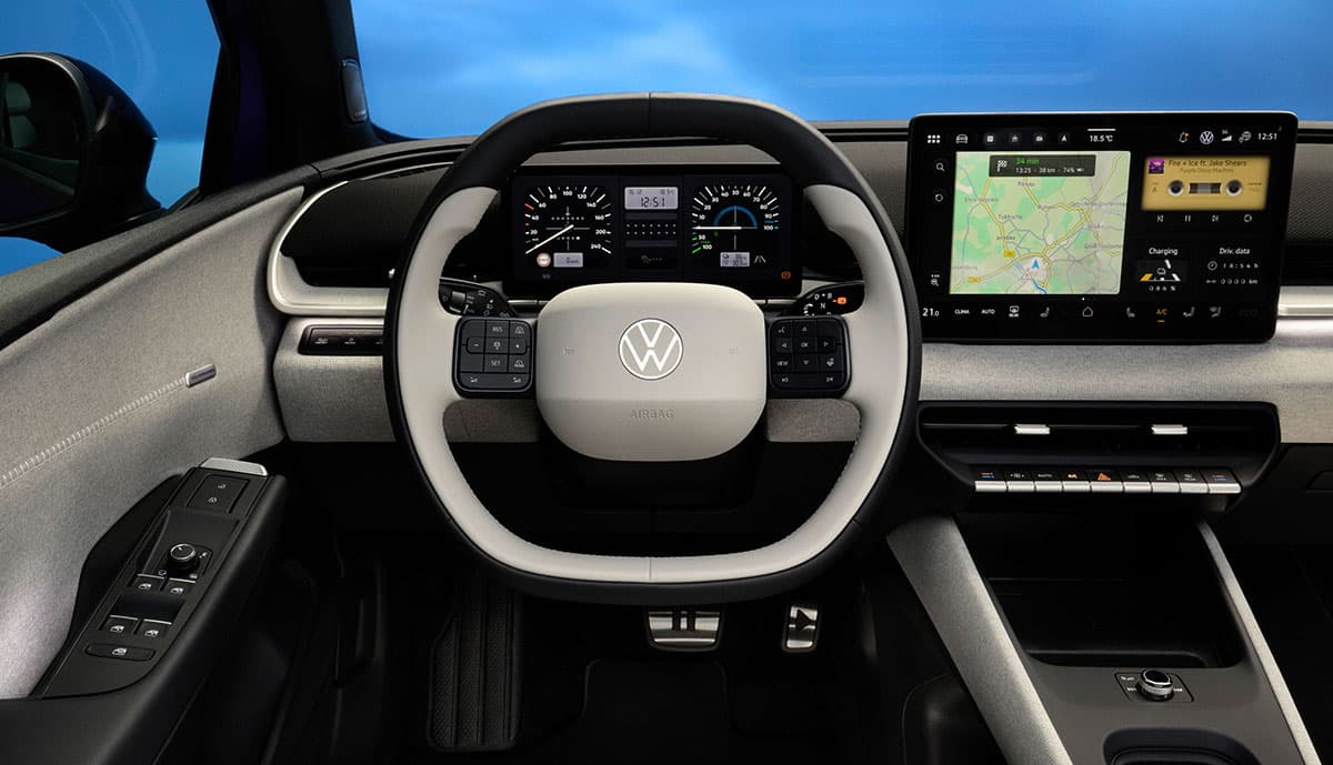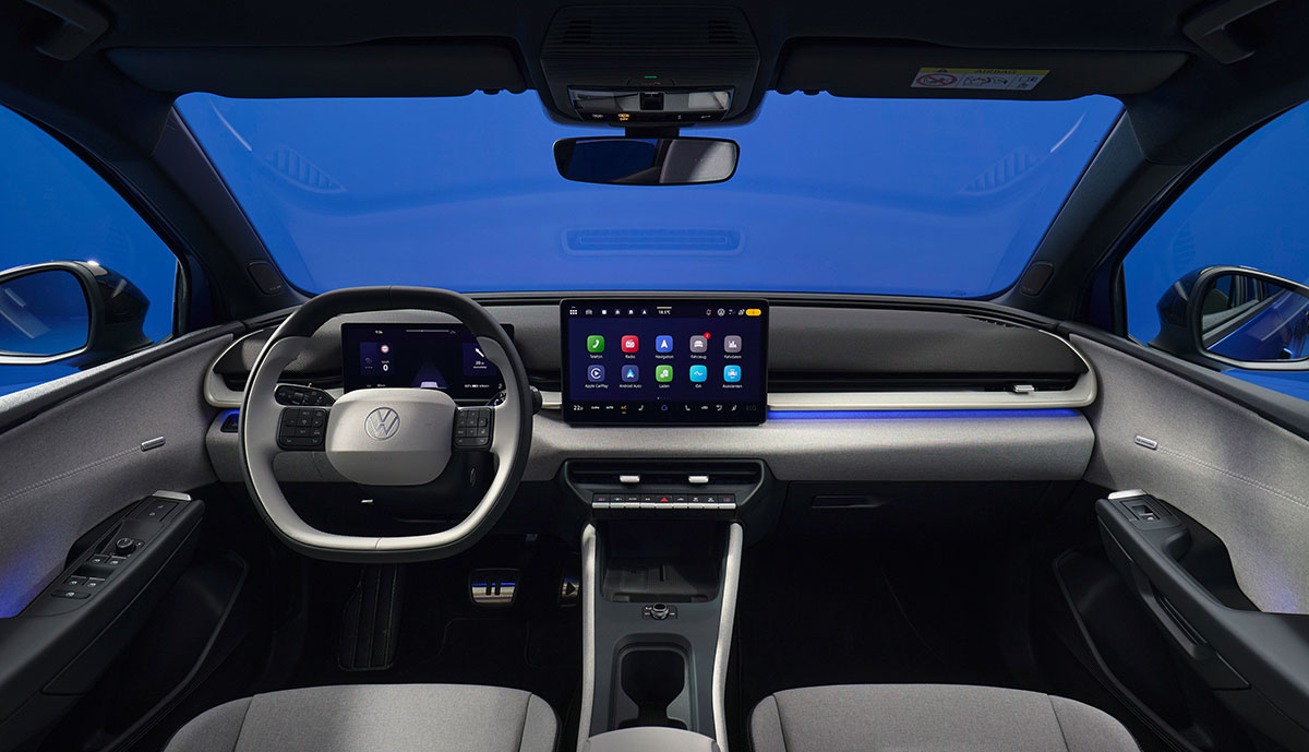 Die Designsprache „Pure Positive“ präge auch das Interieur des ID. Polo – „durch eine intelligente Raumarchitektur, eine hochwertige Materialanmutung sowie eine ausgezeichnete Ergonomie. Die Liebe zum Detail zeigt sich in ausstattungsabhängigen Feinheiten wie edlen Ziernähten in den Türverkleidungen und der Integration kleiner ‚Volkswagen‘-Plaketten zum Abschluss dieser edlen Nähte“.